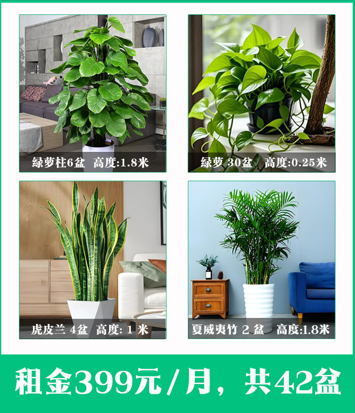 · 绿萝柱:6盆· 绿萝(盆栽):30盆· 虎皮兰:4盆· 夏威夷竹:2盆 总计:42盆/株绿植。 绿植摆放的寓意详解 此套组合不仅数量丰富,更能通过其形态与