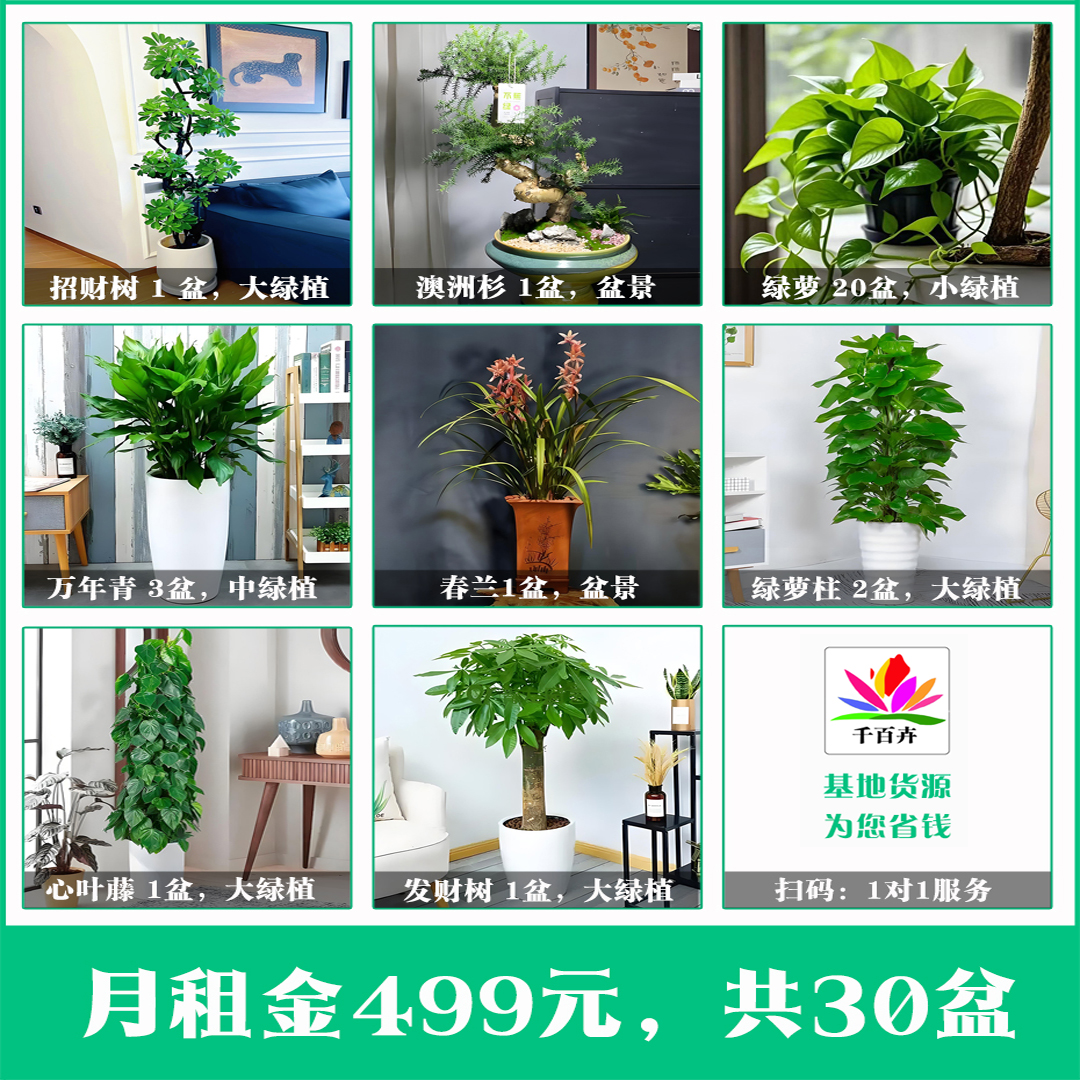 499元/月,一共35盆绿植,租期最短1年。本套餐非常经典,适合事业单位的绿植摆放,35盆足够500左右的办公室。其中网红招财树1盆,网红澳洲杉盆景1盆,春兰盆